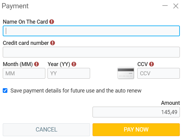 When you click on CC, a form will appear where you can enter your credit card details. Note that if you check the “Save payment details for future use and automatic renewals” box, the information will be saved in the client's file and will be available for future payments. (Not available for PayPal accounts).