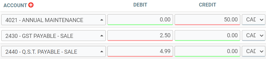 In both categories, use the tax rule None, and choose your GST and QST accounts from the affected accounts at the bottom of the list.