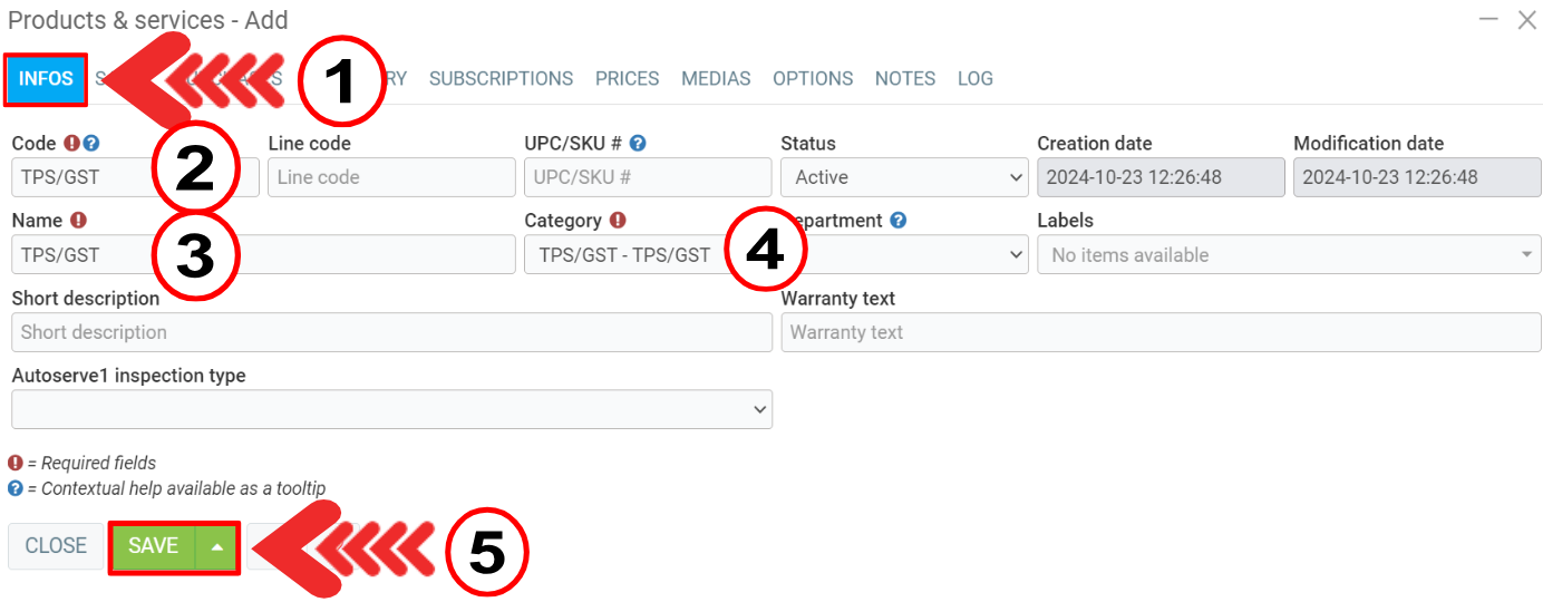 In the Info tab , create a “GST/GST” product linked to the “GST/GST” category and another “TVQ/QST” product linked to the “TVQ/QST” category.