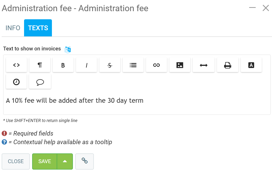 In the Texts tab, if you wish to display a text on the invoices of your customers who have this charge, you can write it in this field.