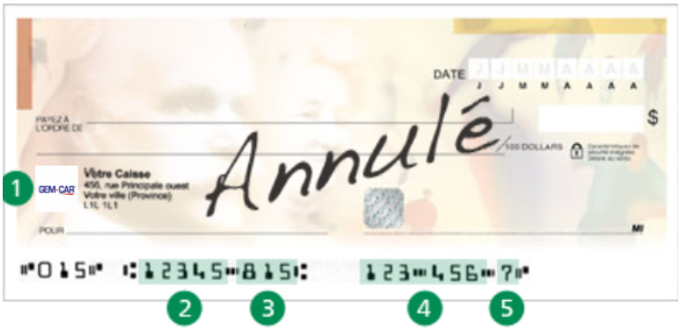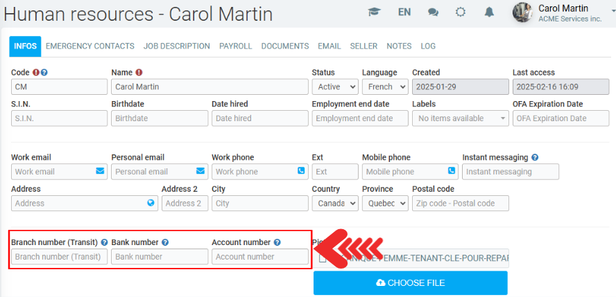 In the Info tab, fill in the Transit Number, Institution Number and Account Number of your human resource's specimen cheque.