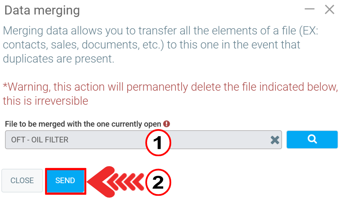 In the next window, enter or search with the blue button to select the record you wish to merge with the current one. It's very important to note that this action is irreversible, so you need to be sure of what you're doing.