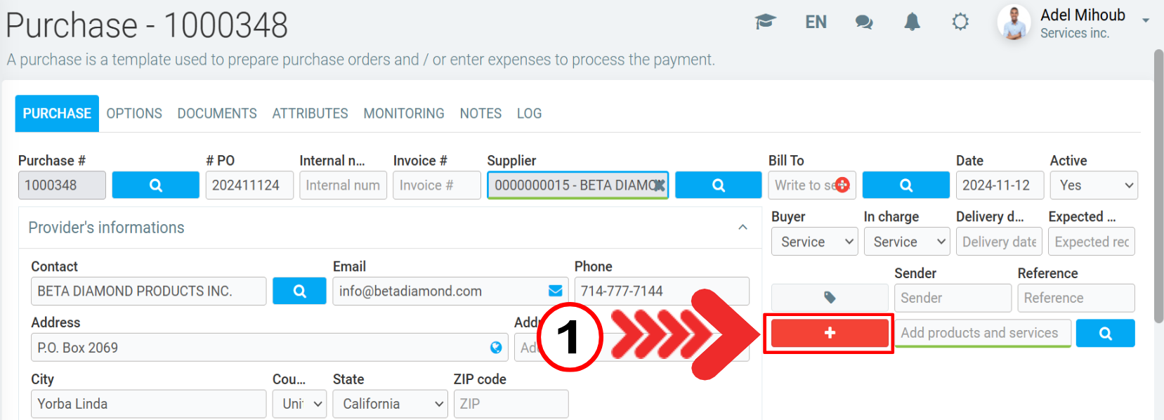 In the purchase window, if you click on the red + button to access the list of Products and Services and you don't find the one you want, you can create a new one by clicking on the +New button.