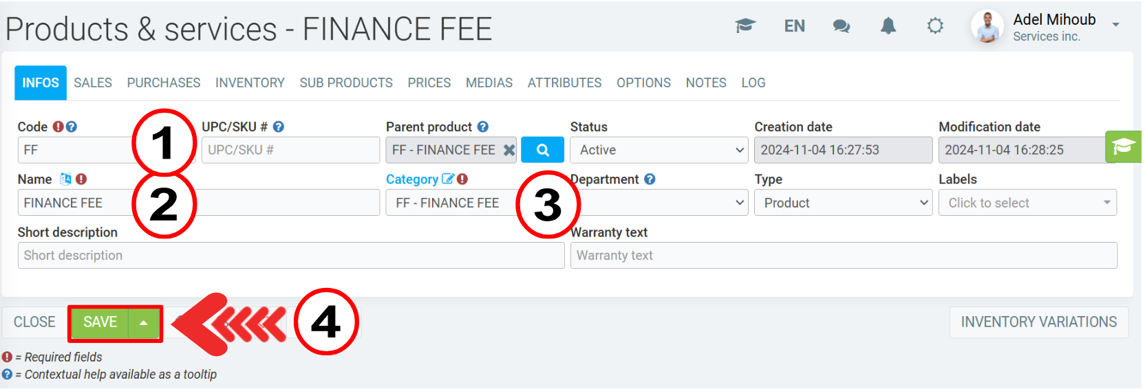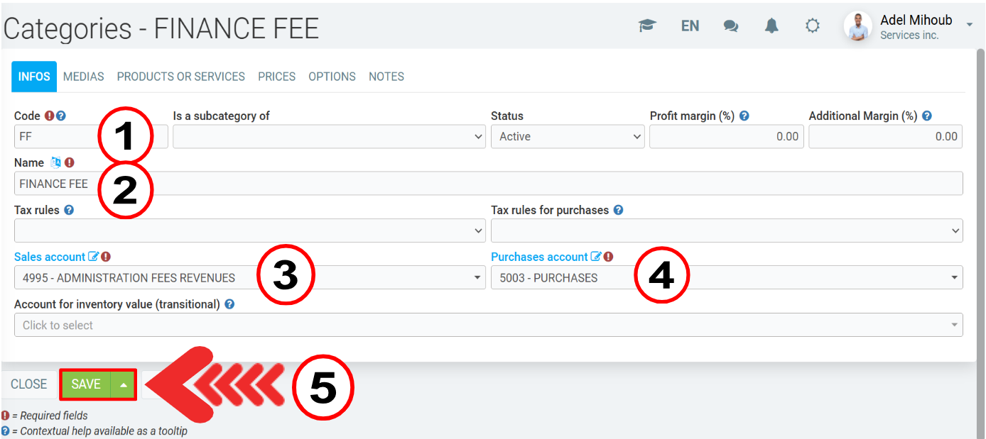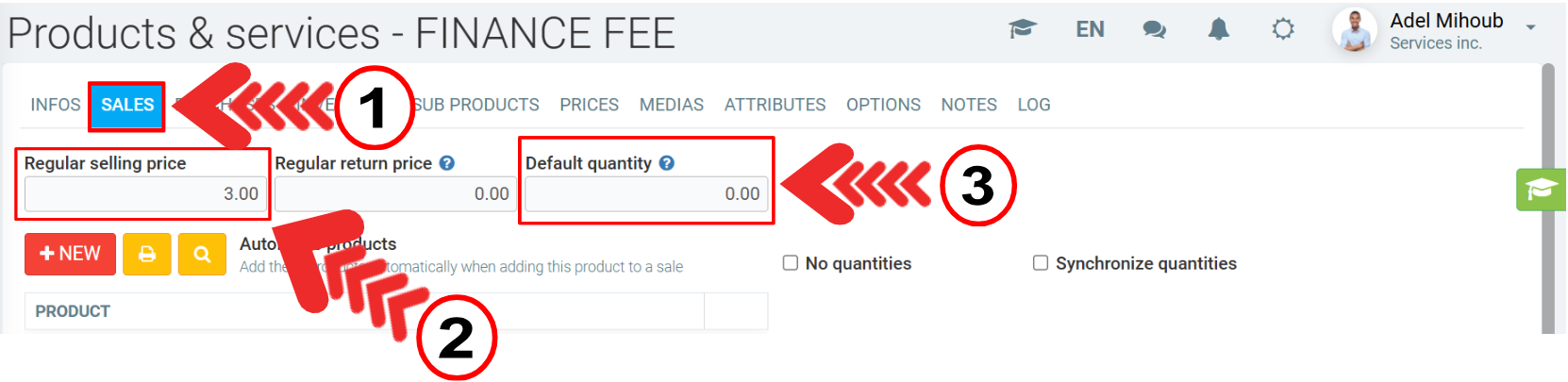 3) After saving it, in the same window, click on the Sales tab, to set the desired fee for the finance charges.