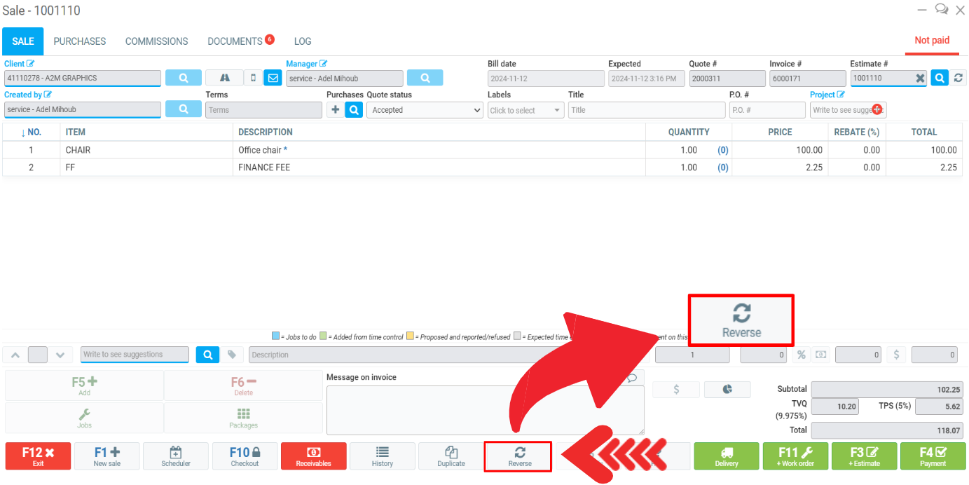 Once you have your sale on the screen, locate the Reverse button with the recycling sign. This button is found at the bottom right of the screen.