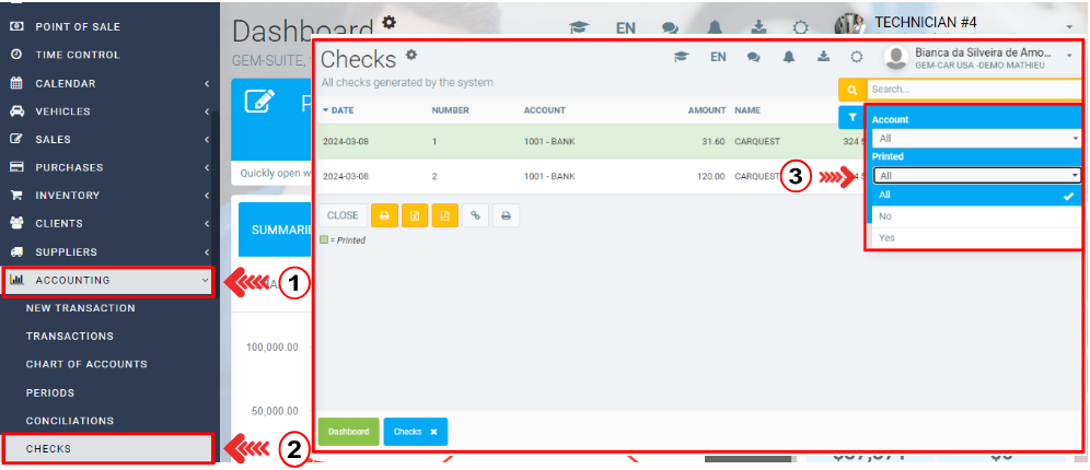 If the check is not appearing in the list, remove the filter from the top right of the page and select “all”. This way, all checks will appear for reprinting.