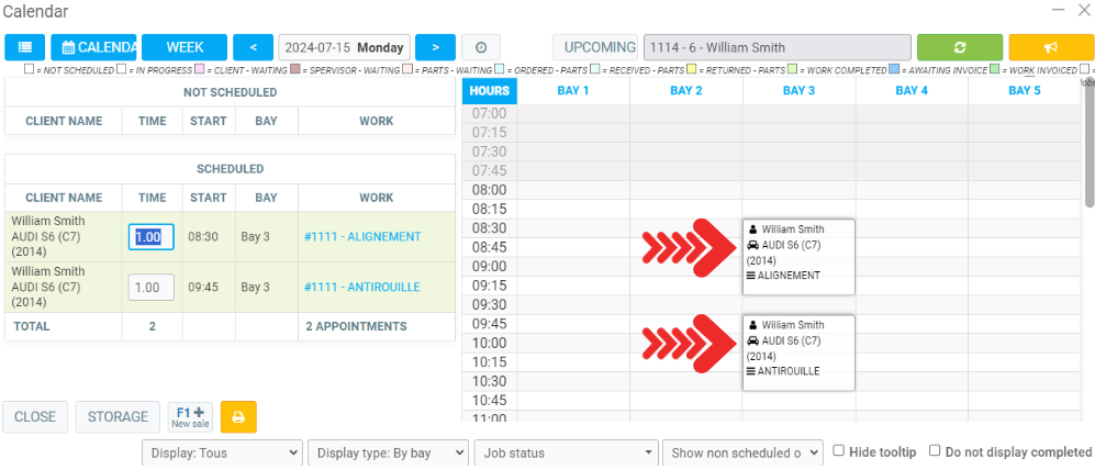 Your calendar will open up on screen, left click on the appointment and drag it to the right time and bay.