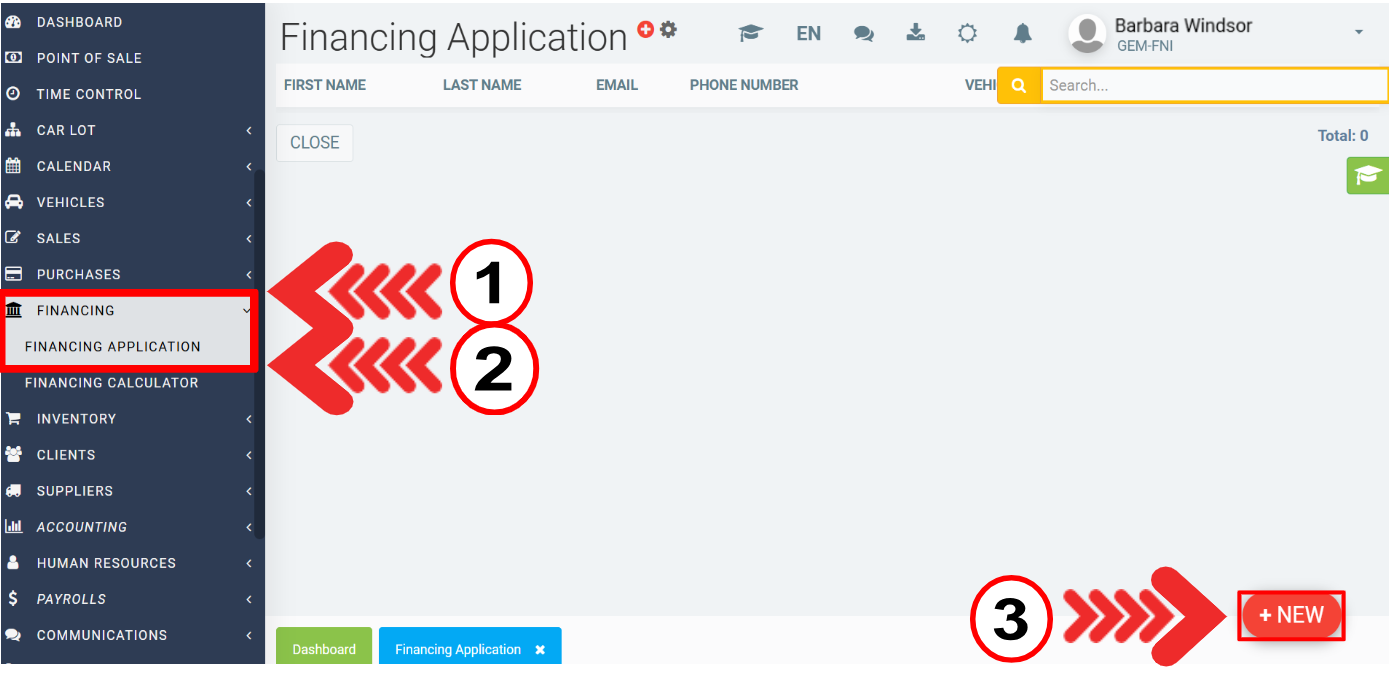 To generate a financing contract, click on the menu Financing > Financing application > +New.