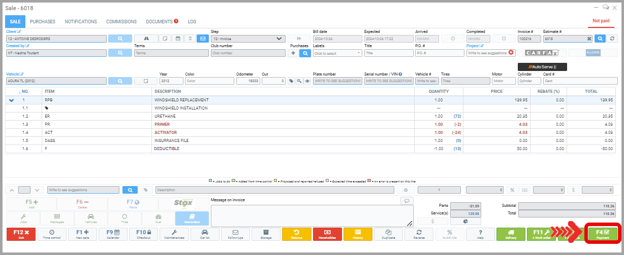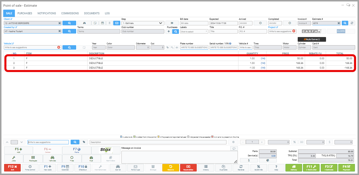 You will notice that 3 lines appear on the new estimate. The first corresponds to the deductible, the second to the amount of the invoice for which the deductible is paid, and the third shows the amount of the second line’s invoice being canceled, as it will be paid by the insurer.
