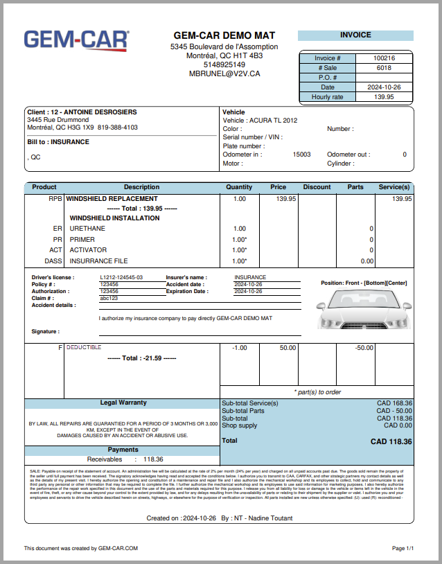 This invoice is intended for the insurer. That is why the amount of the deductible paid by the client appears as a negative on the invoice, so it won’t be paid twice.