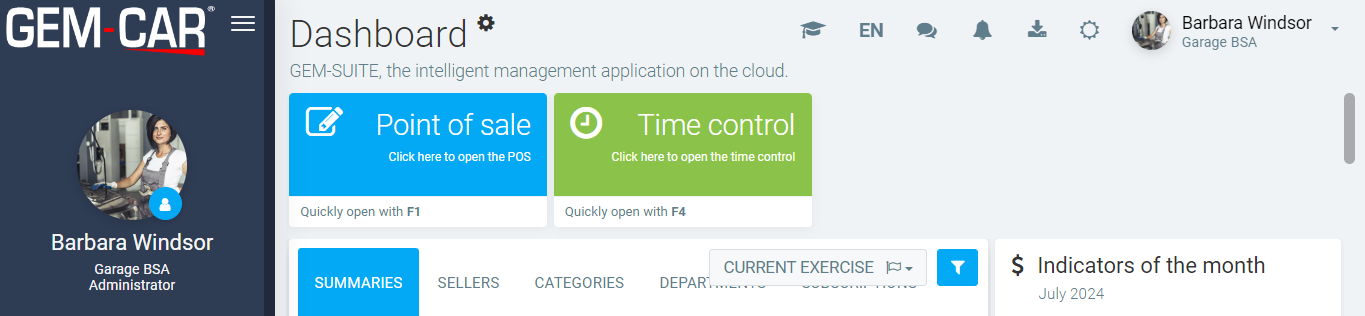 As soon as you access the application, widgets appear at the top of the home screen, to the right of the menu, allowing you to access some of the modules to which your user rights give you access with one click.