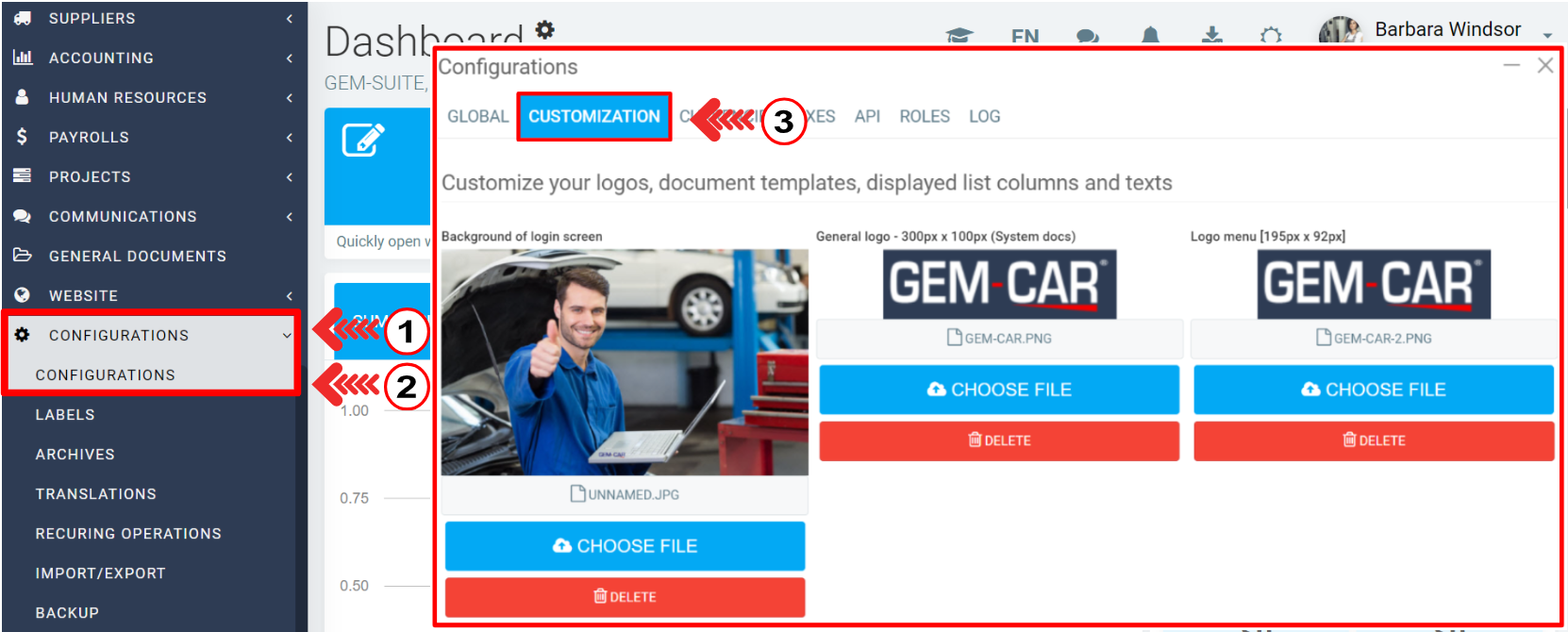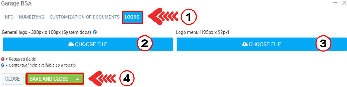 Upload your logo in sections Logo general (System Generated Documents) [suggested aspect ratio 300px x 100px] and Logo menu [suggested aspect ratio 195px x 92px].