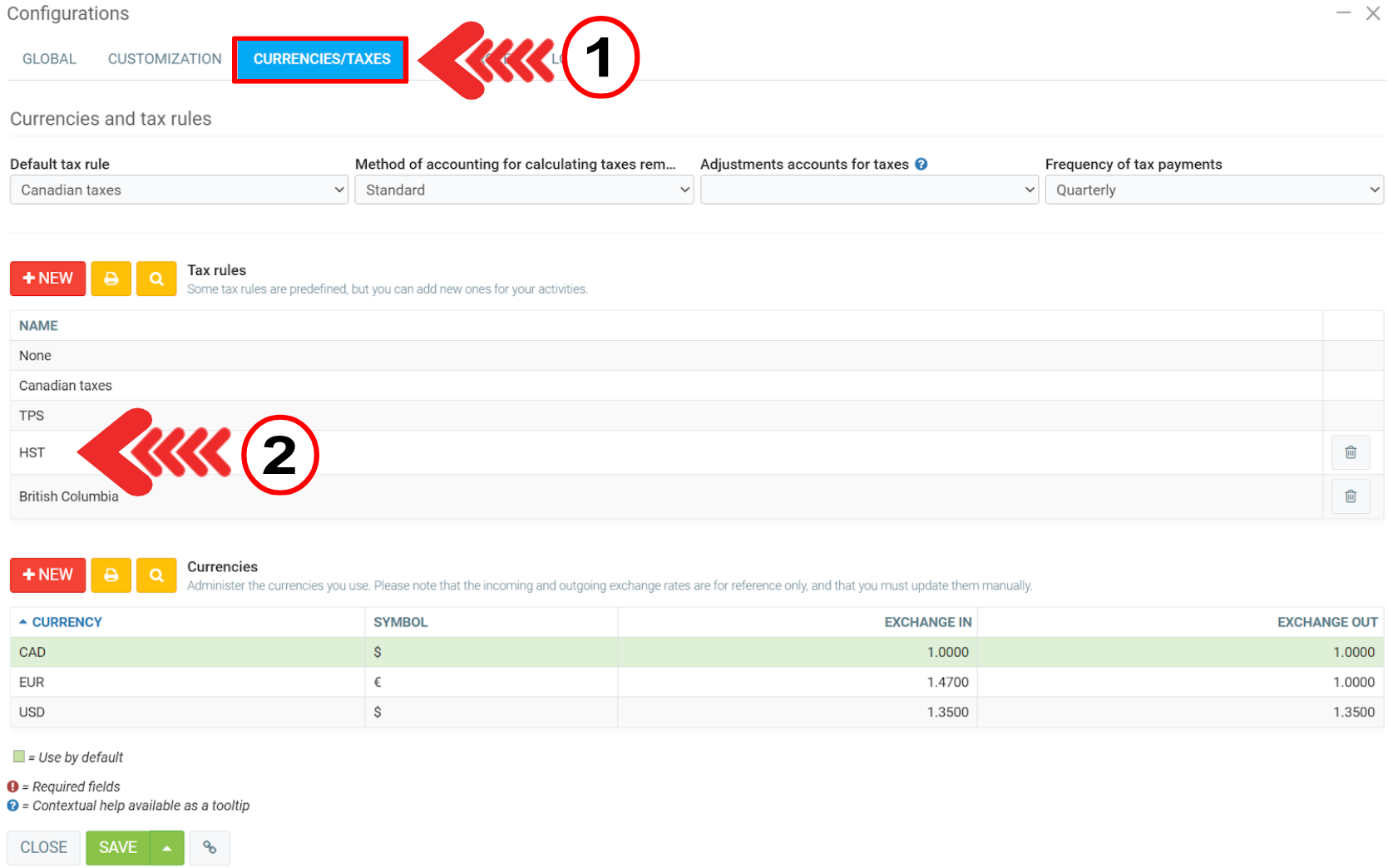 Then click on Currencies/Taxes tab and search for the taxes you want to include or click on +New beside Tax rules.