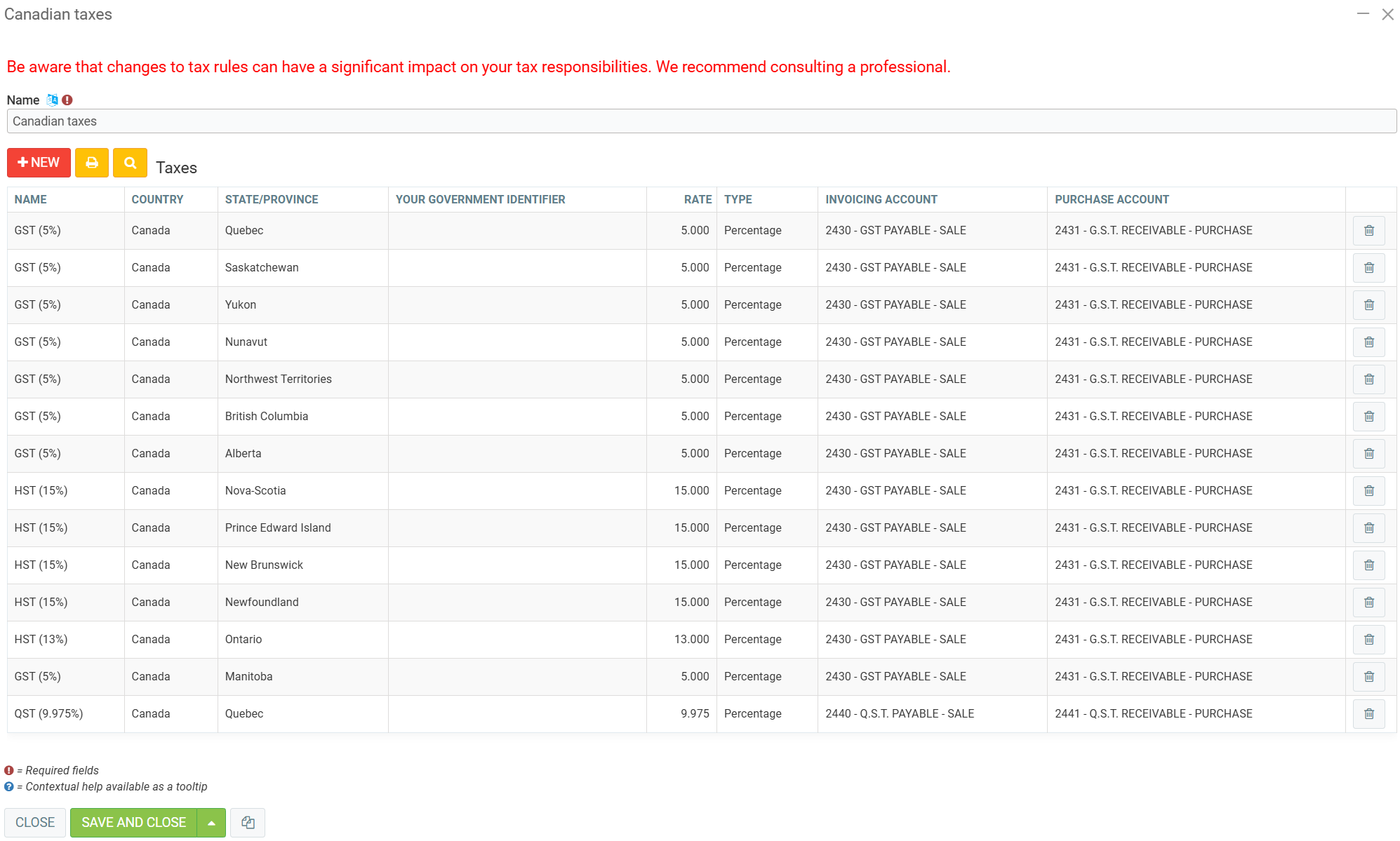 In this section, all taxes are specified by province. You can click on each province to insert your tax numbers. It is important to insert your numbers in each province because if you invoice a customer in a province where the tax number is not listed, it will not appear on the invoice.