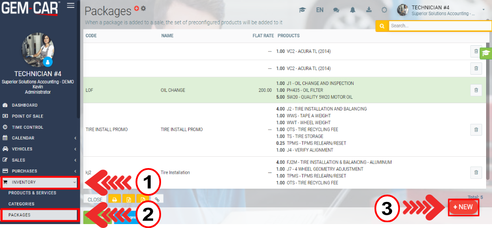 To create a package for some Product & Services to be sold together, click on the left main menu: Inventory > Packages > +New.