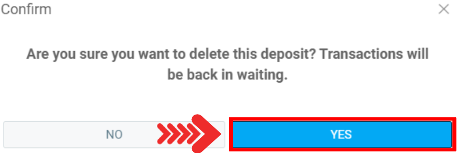 In the dialog box with the following message "Are you sure you want to delete this deposit? Transactions will be back in waiting", click Yes.