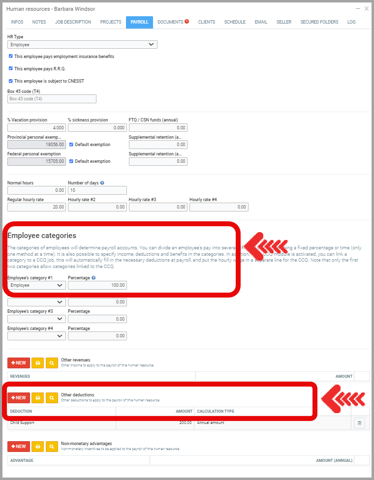 Note: Do not forget to consider that Other Deductions may already apply based on the Employee Category. If an alimony deduction, for example, already applies to the category (we will see how to apply a deduction to a category in point 3) and you also add it to the resource, it will be applied twice.