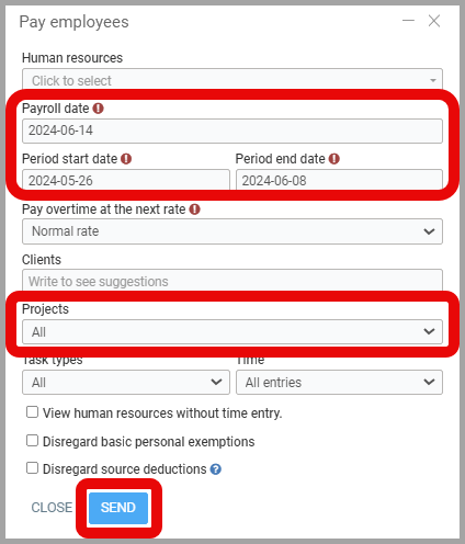 - Select the specific employees you want to pay from the human resources list. Leaving this selection empty will generate a report for all employees.