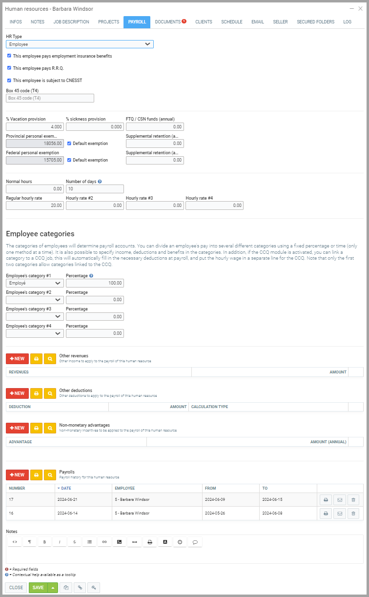 Attention! This tab will only appear on your Human Resources file if you subscribe to the Payroll module and the company processes employee payroll internally, rather than using external payroll services.