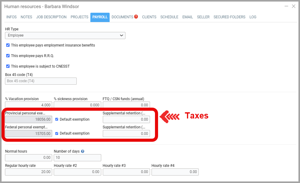 In Quebec, Employment Insurance requires knowing the hours worked by an employee. You must now enter the normal number of hours and a normal hourly rate. If an employee is paid a fixed amount per week, indicate a number of hours and an hourly rate that will correspond to their salary.