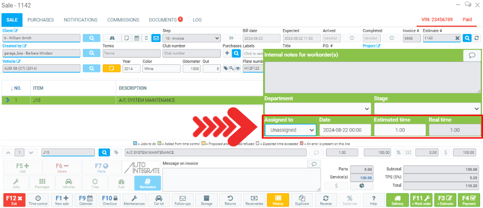 - Assigned to: allows you to quickly choose between the bay or mechanic assigned to the job.