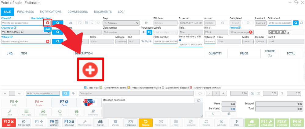 Type the phone number or name of the client in the field Client and press Enter or click the magnifying glass to see the list of clients existing.