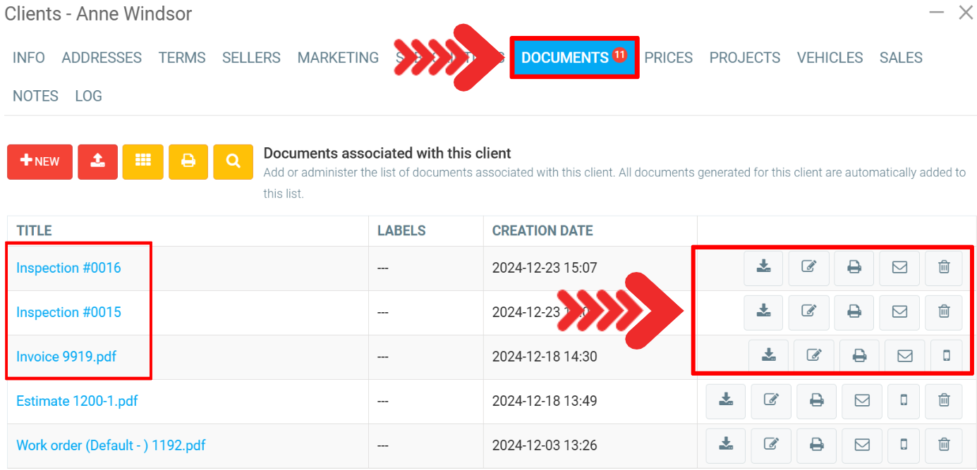 3) Under the Documents tab, click on the icon associated with the action you wish to take, according to the legend below: