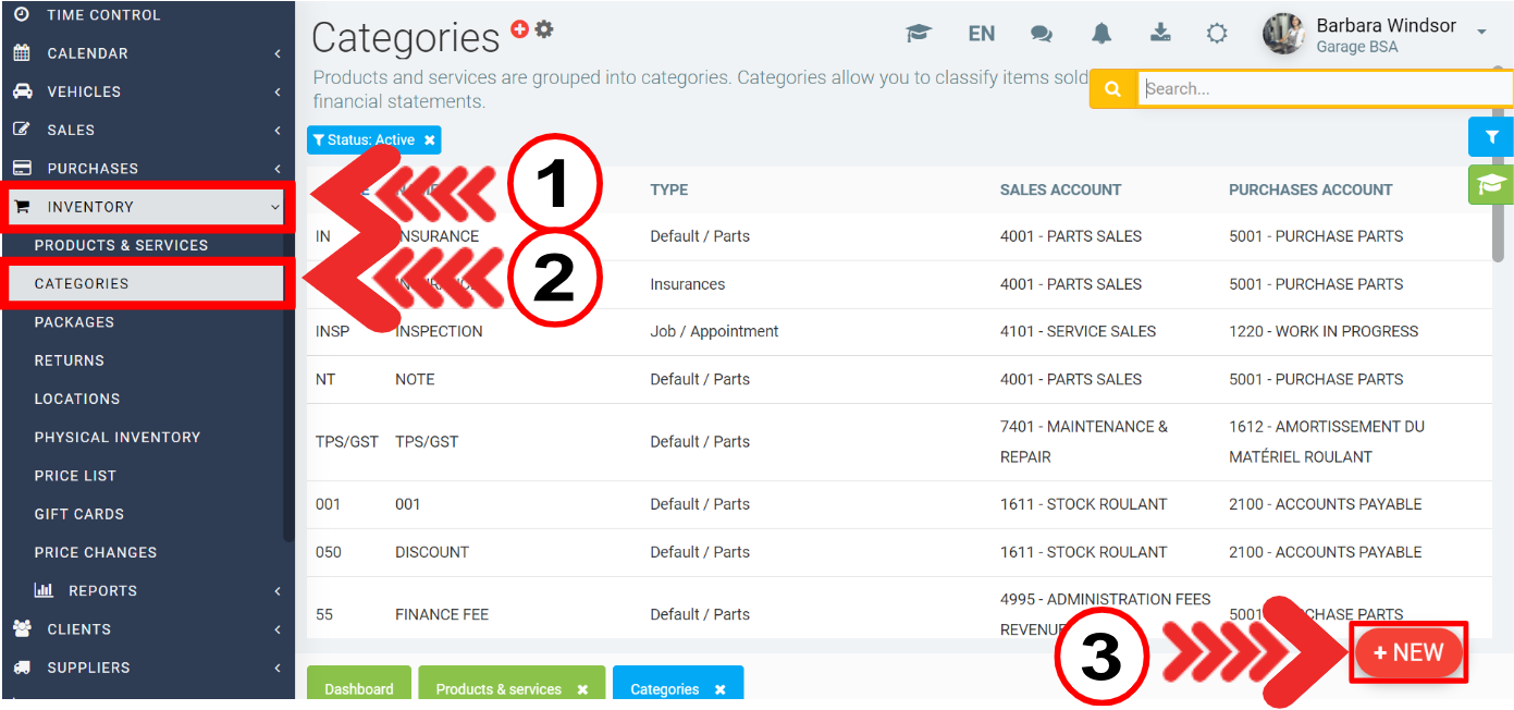 To create a deposit as a type of category, click on Inventory > Categories > +New.