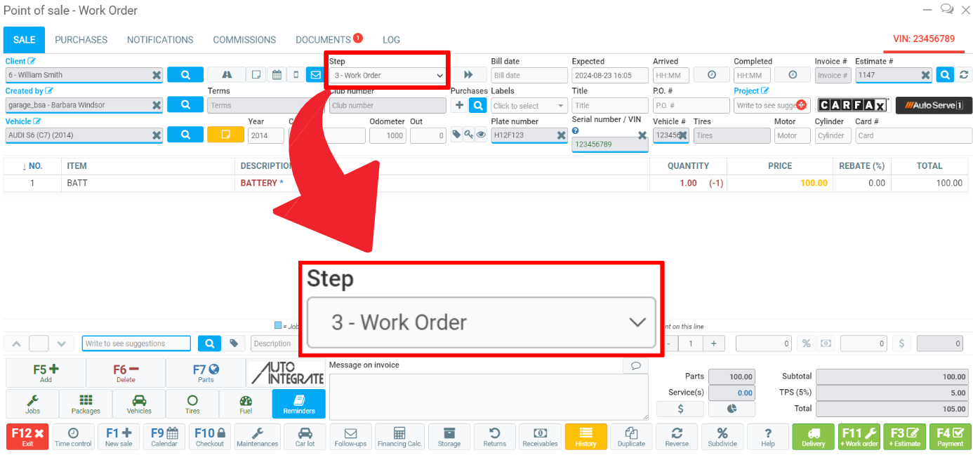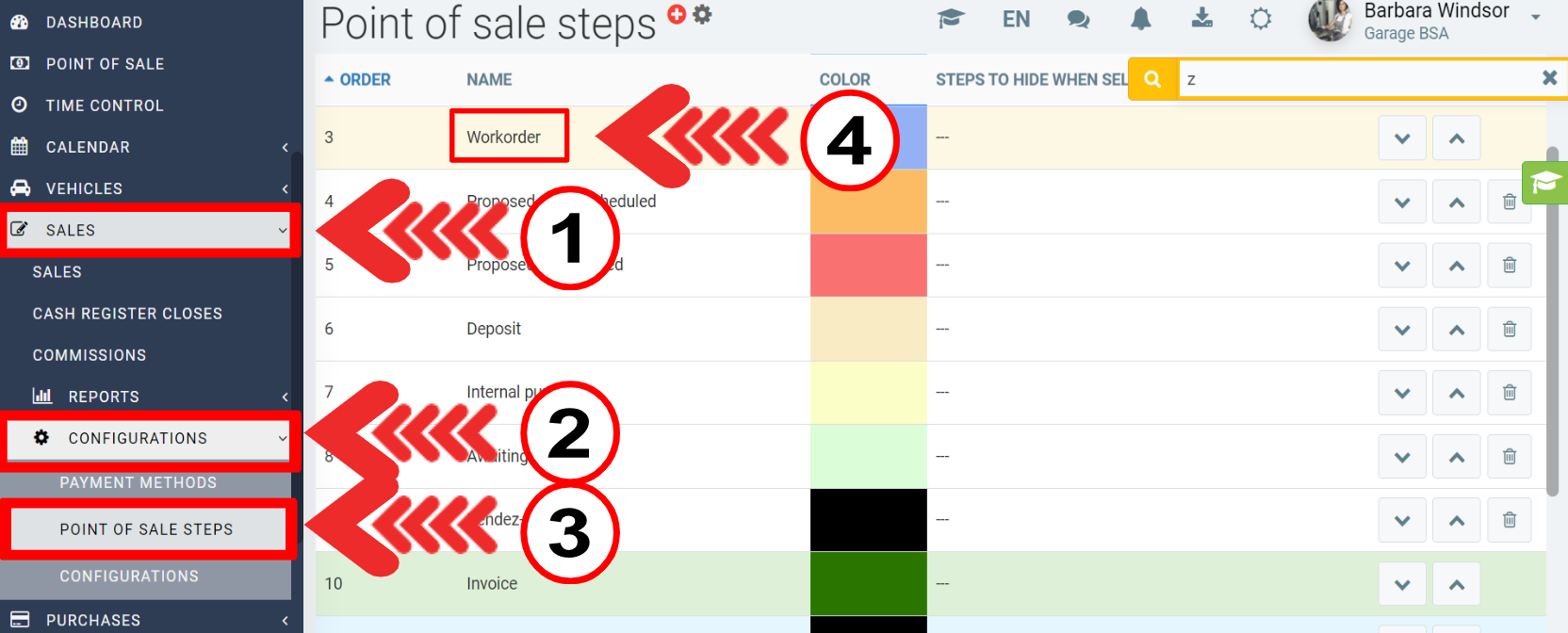 From the left main Menu, click on Sales > Configurations > Point of Sale Work Steps and choose a step like Work Order.