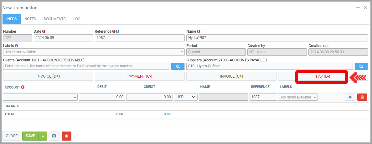 Select the supplier you want to pay from the Supplier box using the suggested results list. Once the supplier is selected, click the PAY (D-) button.