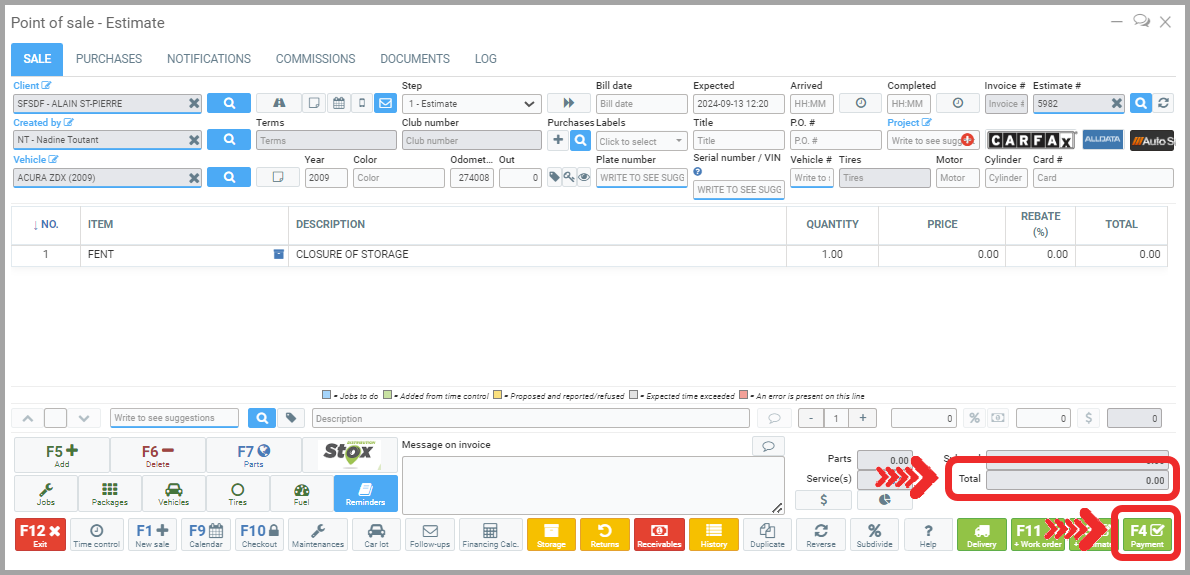 To remove tires from the list of available tires for storage, from the Point of Sale, enter the product code FENT. This is the default product code configured for closing a tire storage. Then press the Enter key.