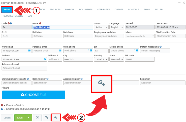 When you click on the key icon, GEM-CAR presents you with a pop-up window from which access to the data will be defined for the Technician #4.