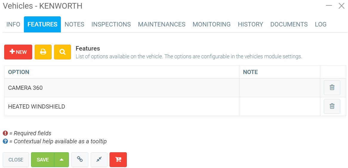In the Features tab of the sheet, you can configure all kinds of options on the vehicle.