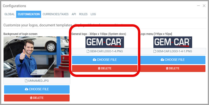Then, as far as images are concerned, GEM-CAR will take by default certain images that have been configured in GEM-CAR in a more general way, particularly in the Configurations > Configurations > Customization tab.