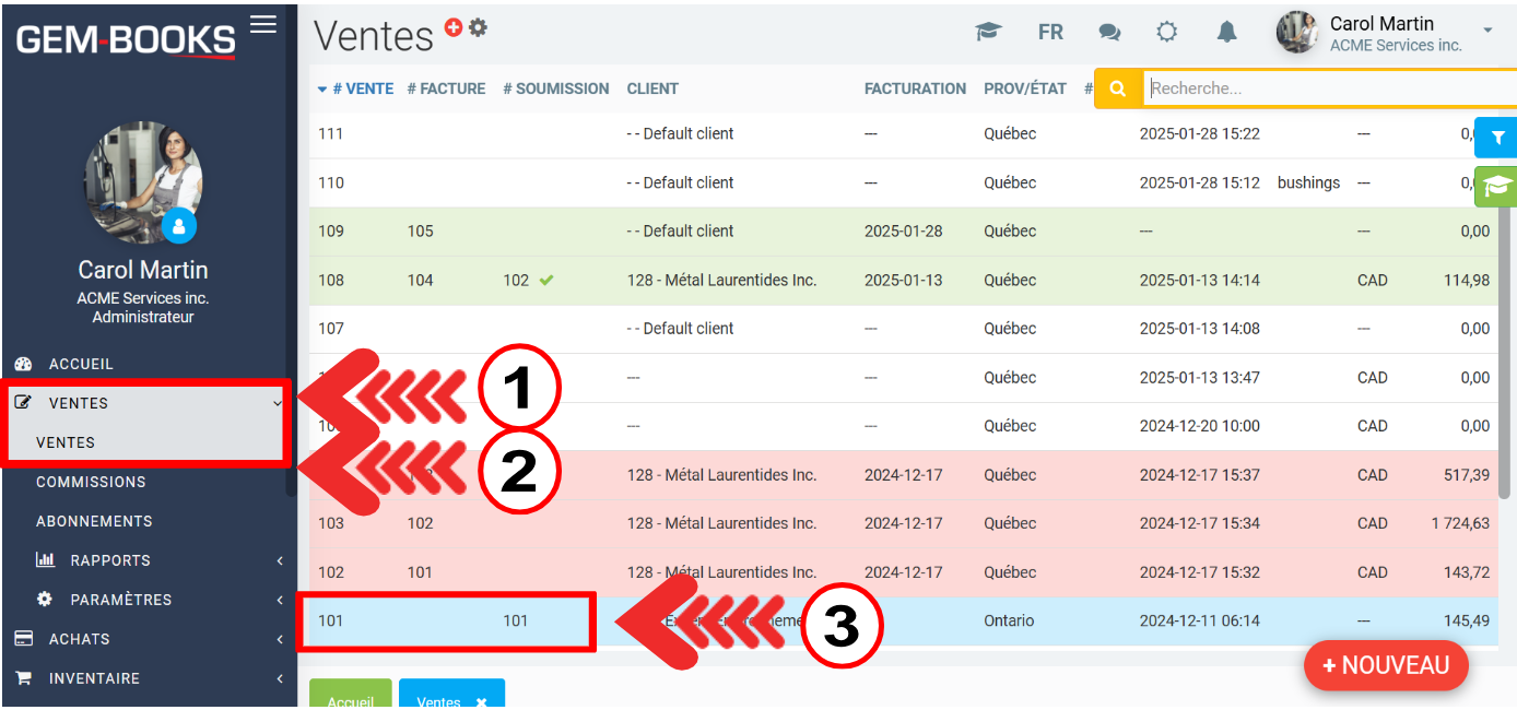 Pour vérifier la configuration, cliquez sur Ventes > Ventes et rendez-vous sur une vente facturée.