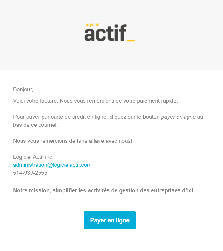 Le même écran sera proposé à vos clients lorsque vous envoyez une facture par courriel. Un nouveau bouton sera affiché dans les courriels de facturation que vous enverrez à vos clients ce qui leur permettra d'effectuer le paiement enligne directement à la réception du courriel.