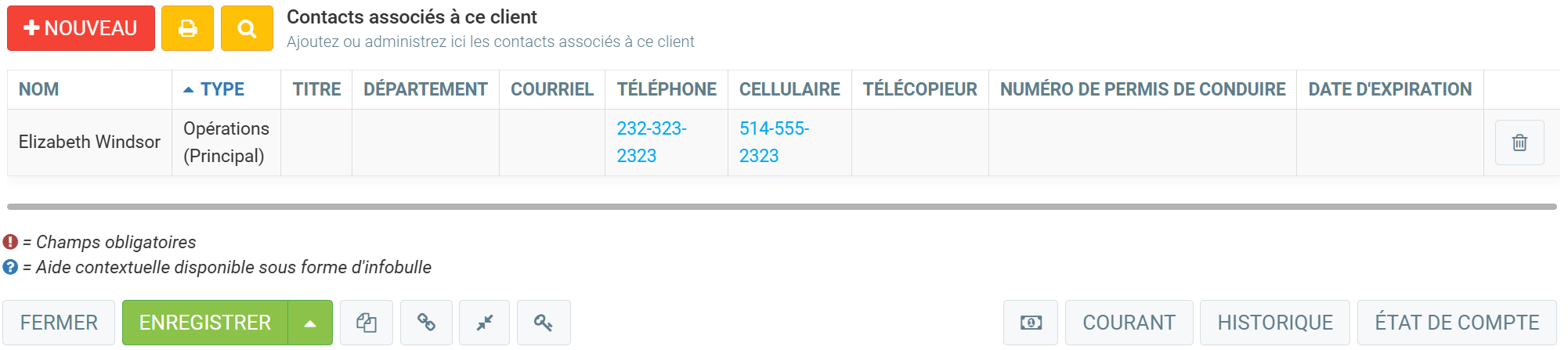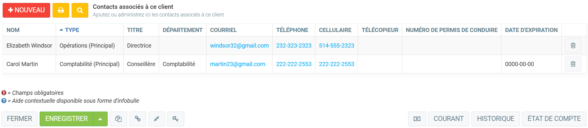 Dans la section suivante, dans l'onglet Info, vous ajoutez les Contacts associés à ce client. Cela vous permet de spécifier le nom de vos interlocuteurs dans cette société : par exemple le service d’achat, le service de comptabilité, et autres. Les types Opérations principales, Comptabilité principale et communications recevrons certaines informations. Par exemple, les contacts de type Comptabilité principal recevront les factures et les états de compte générés par GEM-BOOKS.