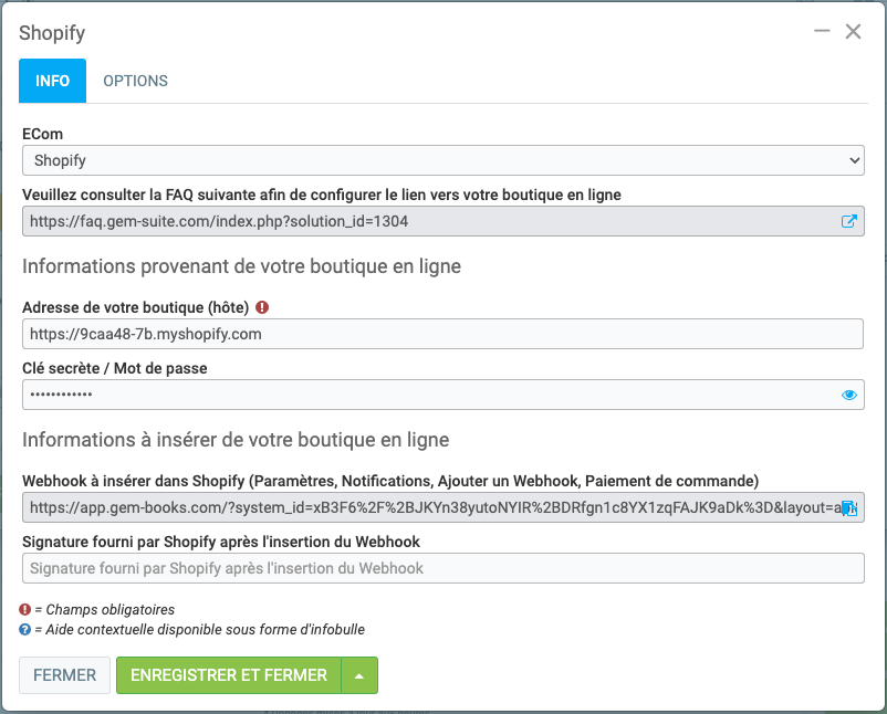 De retour dans GEM-BOOKS, collez cette chaîne de caractères dans la Signature fournie par Shopify après l'insertion du Webhook.