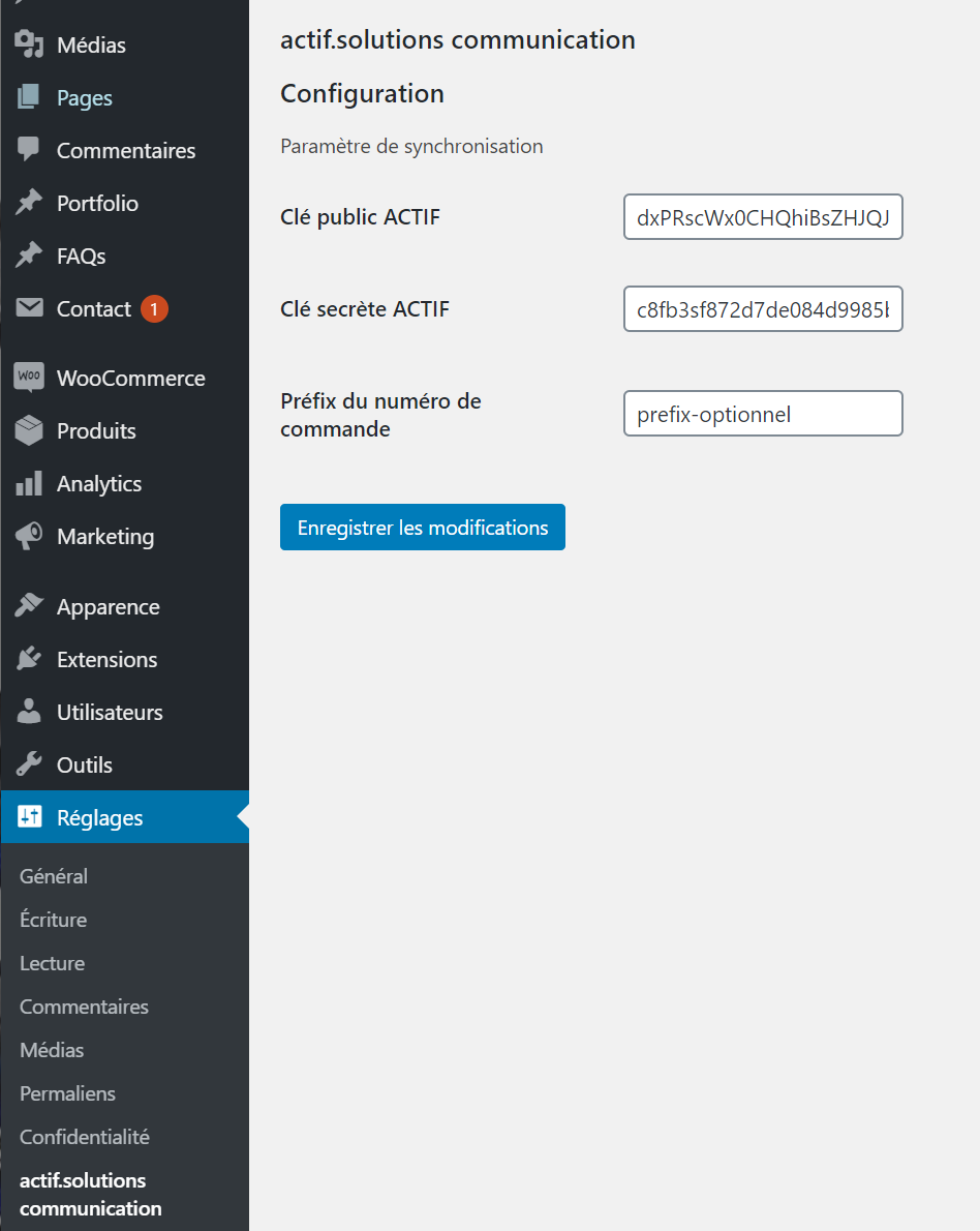 Rendez-vous ensuite dans la section Réglages, actif.solutions communication pour renseigner les champs suivants que vous avez générés précédemment.