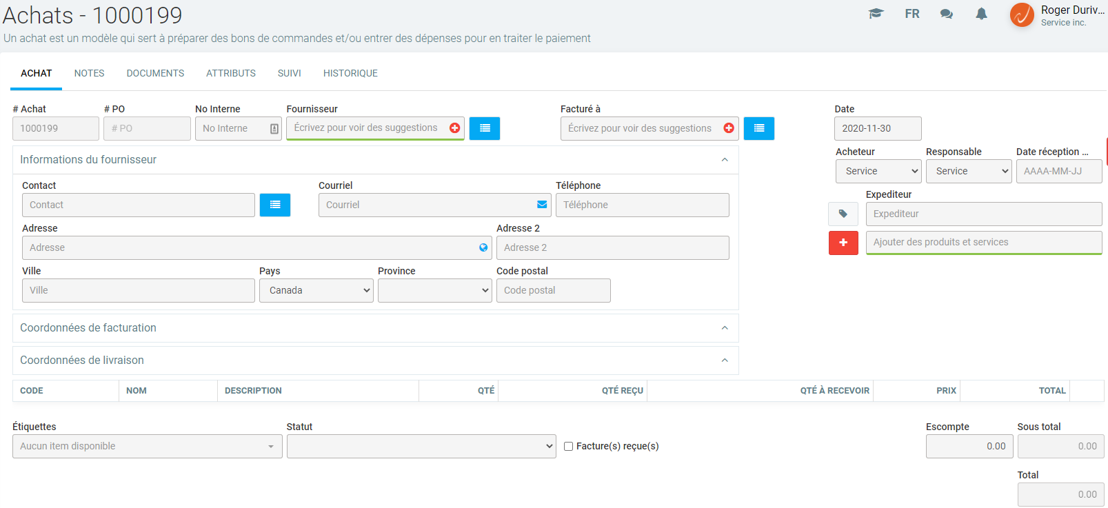 Le module Achats fonctionne de la même façon que le module Ventes, c'est-à-dire, il vous suffit d'entrer un fournisseur et ensuite d'entrer les produits que vous désirez acheter.