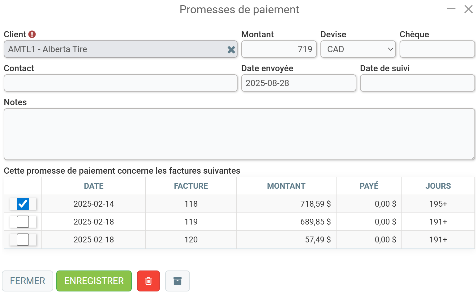 Dans l'option Cette promesse de paiement concerne les factures suivantes, cochez les factures qui correspondent au montant promis par le client.
