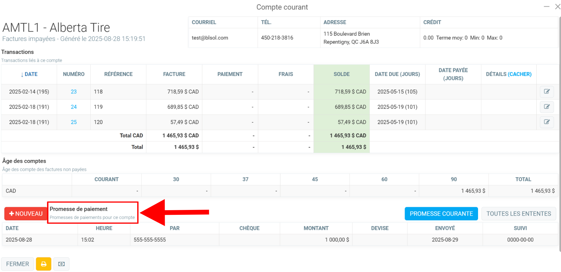 La page affichera les détails sur les factures impayées du client et, en bas de la page, vous trouverez le menu Promesse de paiement.