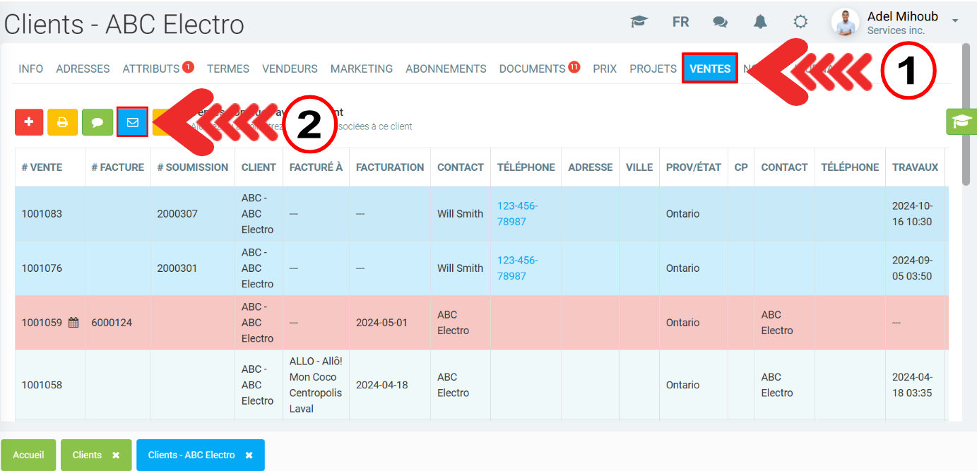Dans la fiche du client, cliquez sur l'onglet Ventes et ensuite sur l'icône bleue représentant une enveloppe.