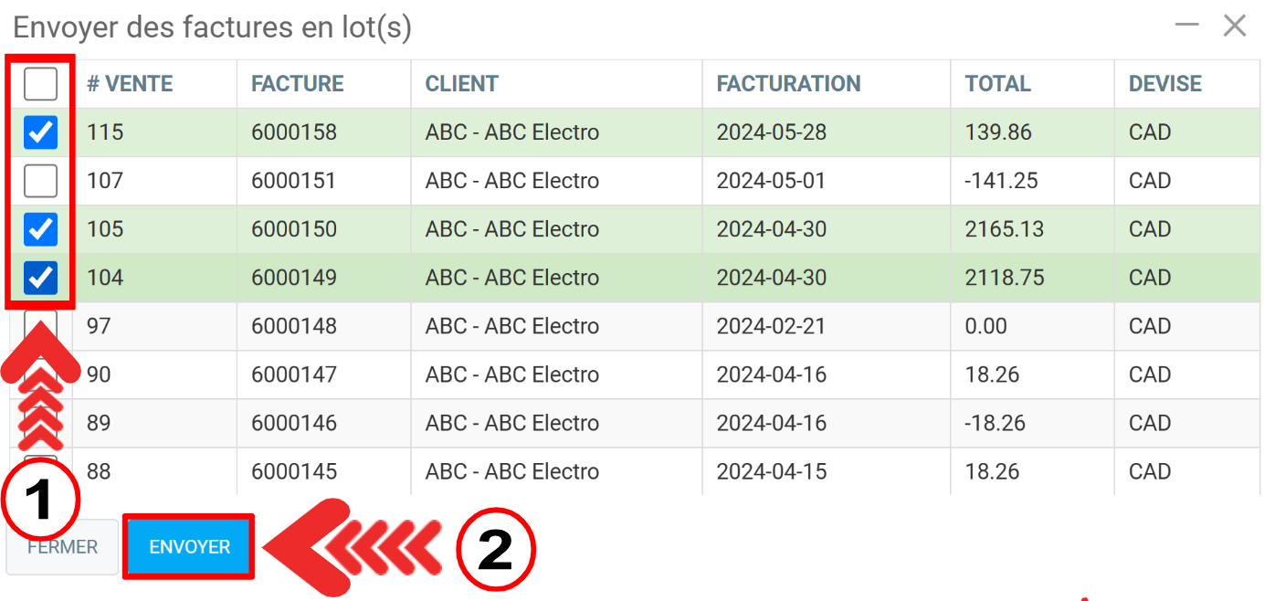 Une liste des factures du client apparaît. Cochez les factures que vous désirez lui envoyer par courriel et cliquez sur Envoyer.