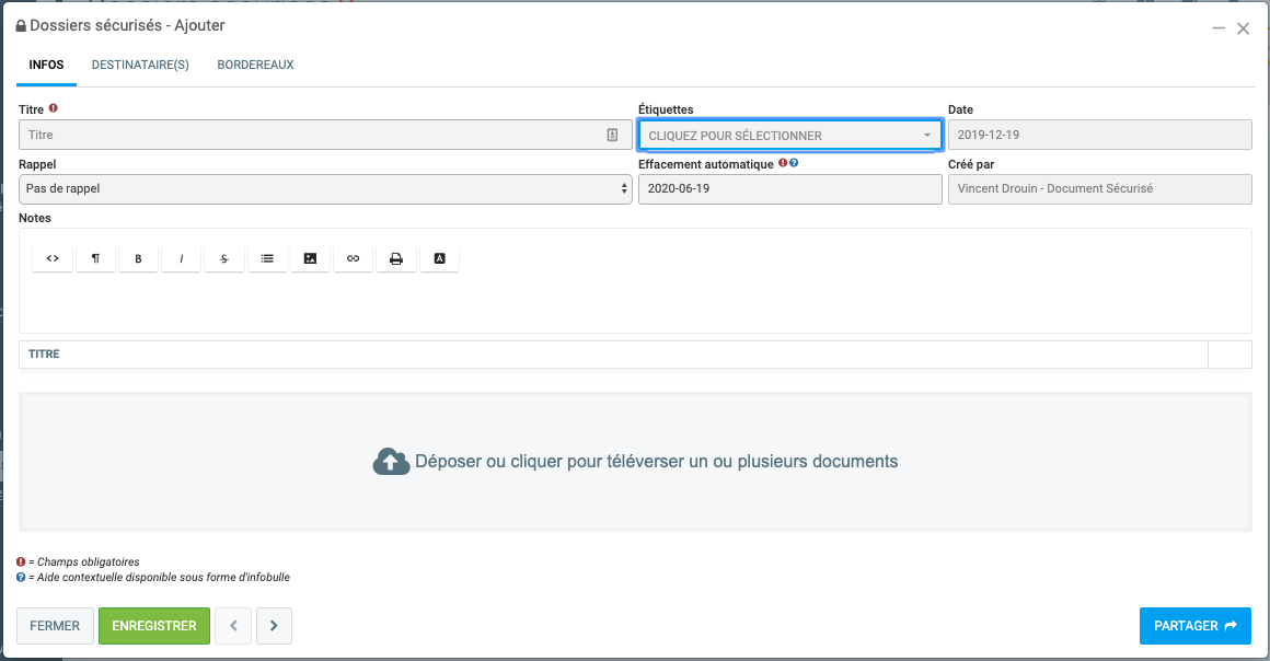 Les étiquettes créées ici seront applicables dans la fenêtre Dossiers sécurisés, sous l'onglet INFOS.