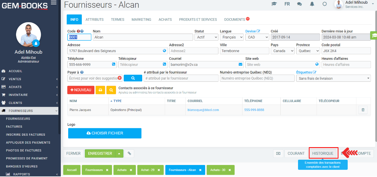 Retournez dans Fournisseur > Fournisseur et sélectionnez le fournisseur souhaité, puis cliquez sur Historique.