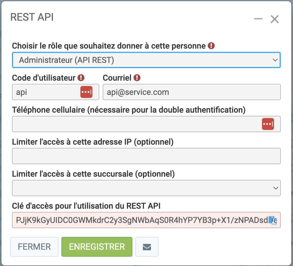 Note : Il n'y a que le superadministrateur du système qui peut voir les clefs API. Merci de faire vos tests avec un utilisateur qui possède les rôles d’administrateurs. De cette façon, quand vous ajusterez les rôles de cet utilisateur et que l'API cessera de fonctionner pour certaines actions, vous saurez que c'est l'utilisateur qui n'a pas droit à cette fonction en particulier.