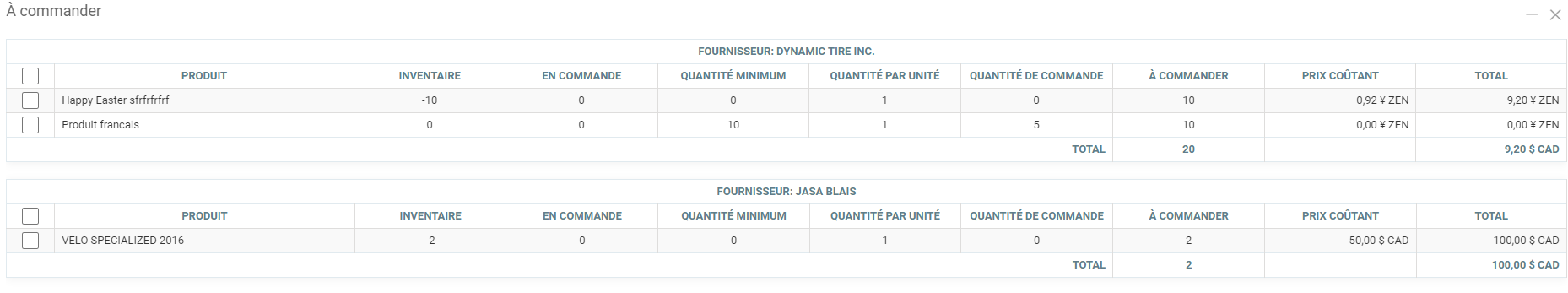 Pour commander les produits qui sont en manque, cliquez sur le menu Achats puis À commander. Un écran comme celle-ci vous sera présentée :