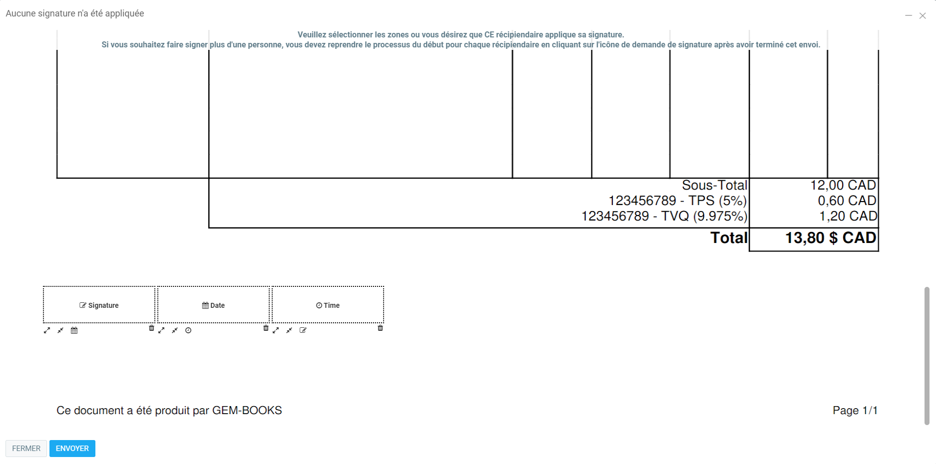 - Cliquez sur le bouton Envoyer en bleu pour envoyer le courriel contenant le PDF du document ainsi qu'un lien pour signer le document en ligne.