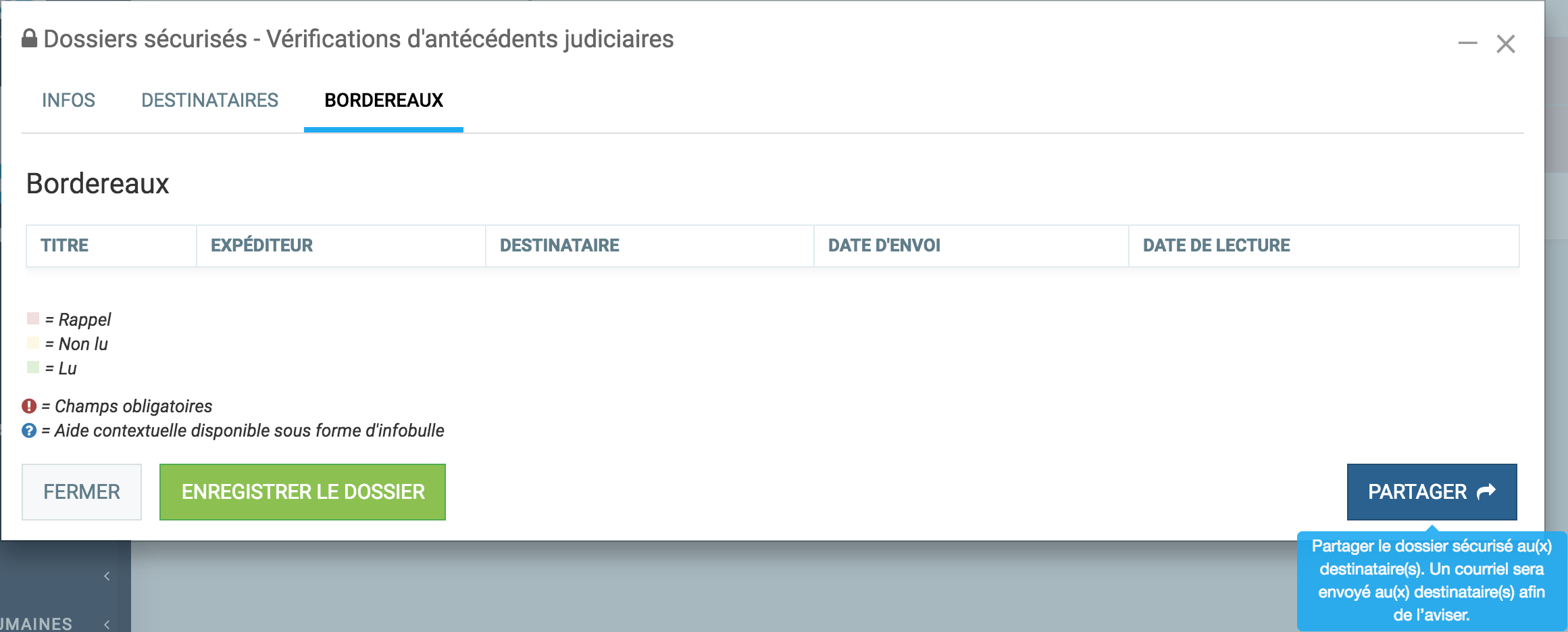 Les dossiers sécurisés sont ceux que vous préparez, mais que vous n’avez pas encore partagés. Dès que vous partagez un dossier, il apparaît immédiatement dans le panneau Bordereaux.